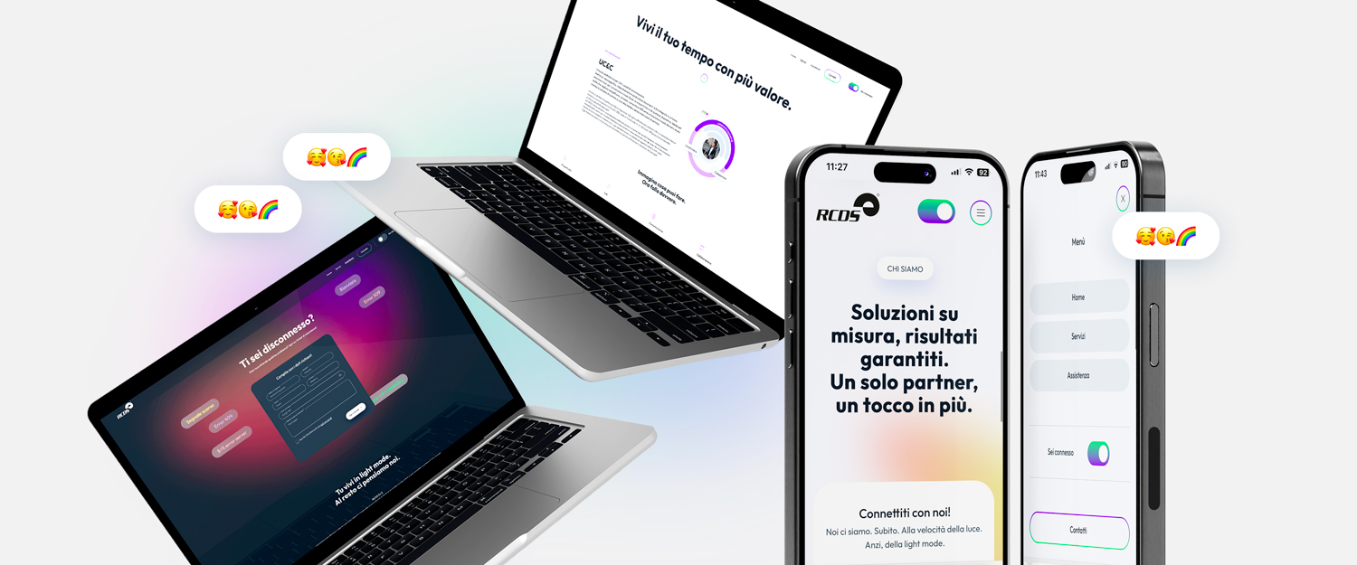 Per il nuovo sito di RCDS abbiamo progettato un’esperienza che racconta una trasformazione: dal buio alla luce. In Dark Mode, l’interfaccia è essenziale, quasi un invito a esplorare ciò che ancora deve emergere. Passando alla Light Mode, il sito si anima, i colori prendono vita e i contenuti si mostrano con chiarezza, accompagnando l’utente in un percorso coinvolgente e fluido.